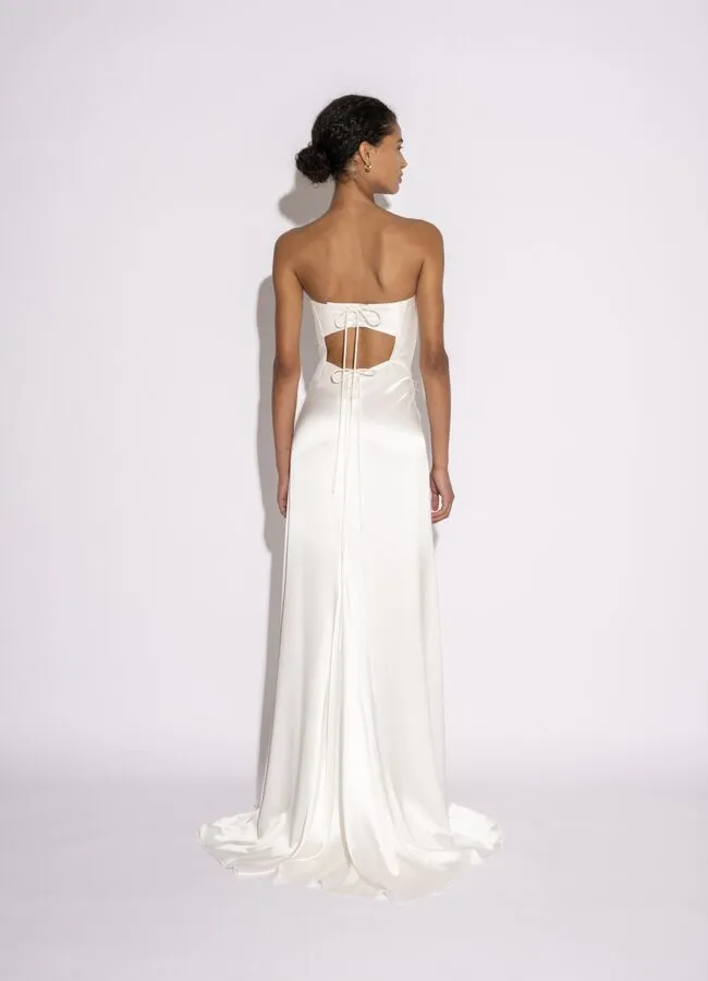 La robe BB:39 est une pièce inspirée de la période Régence, avec un corset sensationnel confectionné à partir d'une magnifique combinaison de soie grège dupion et de satin doux comme du beurre.