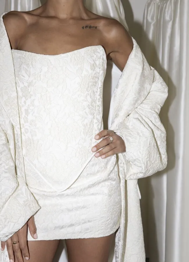 Un ensemble parfait à la silhouette épurée et sculptée. Conçue pour se porter avec différentes jupe pour un effet maximal. La pièce parfaite à enfiler après la cérémonie — sobre, naturelle et idéale pour l’after-party.